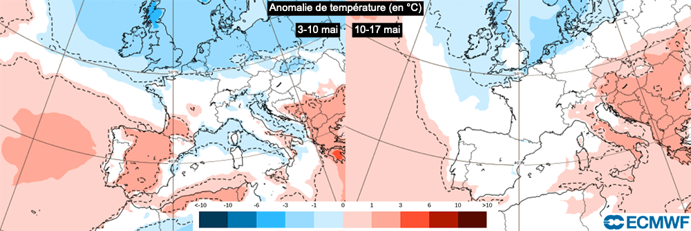 Anomalie de température (en °C) du 3 au 10 mai et du 10 au 17 mai - modèle CEP via ECMWF