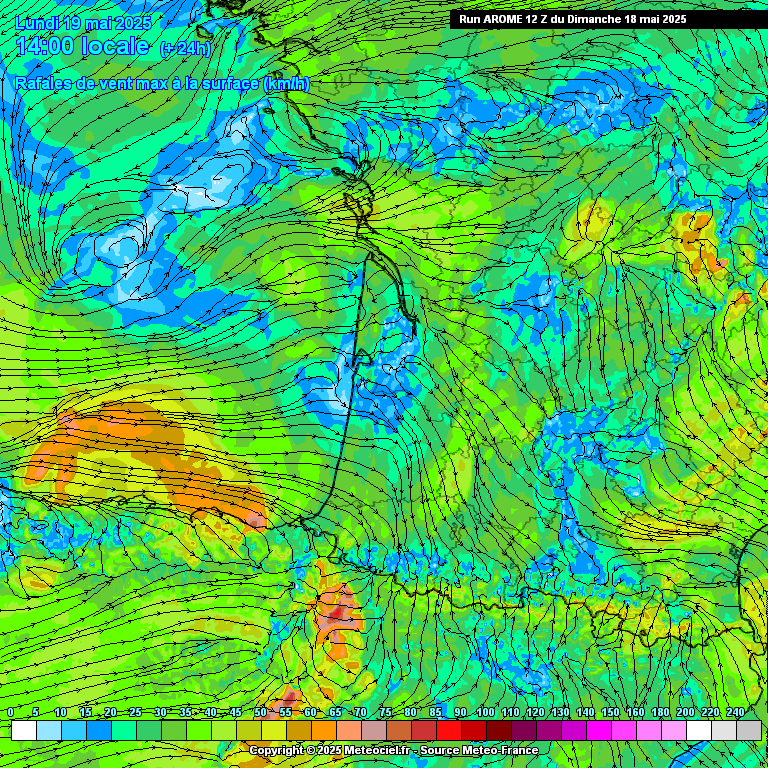 Rafales de vent maximales prévues entre la nuit de dimanche 18 mai à lundi et la soirée de lundi 19 mai dans le Sud-ouest. Modèle Arôme - Meteociel
