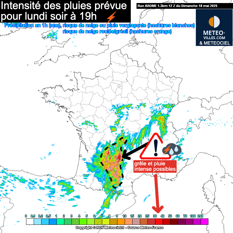 Certaines simulations indiquent des lames d’eau pouvant dépasser 30 mm/h, mais nous savons par expérience que ce type de phénomène n’est pas prévisible et qu’il peut localement tomber beaucoup plus.