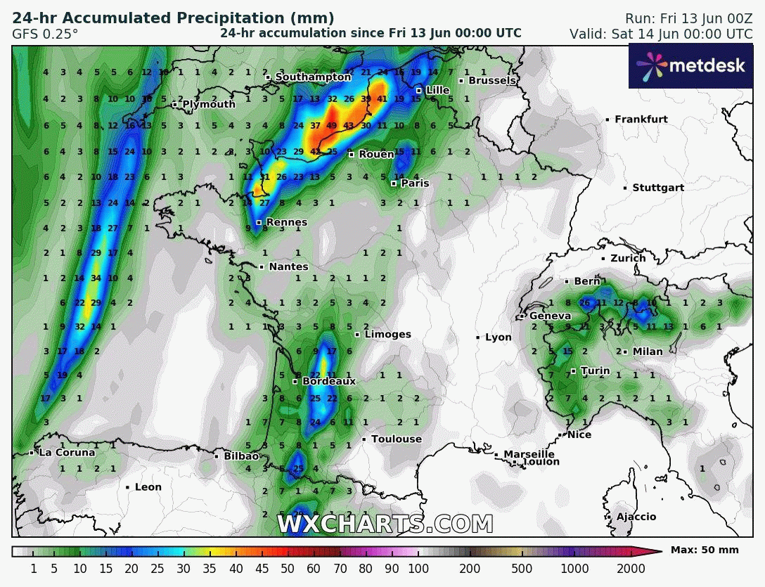 Animation des précipitations sur la France du 13 au 20 juin 2025 – Modèle GFS via WX CHARTS