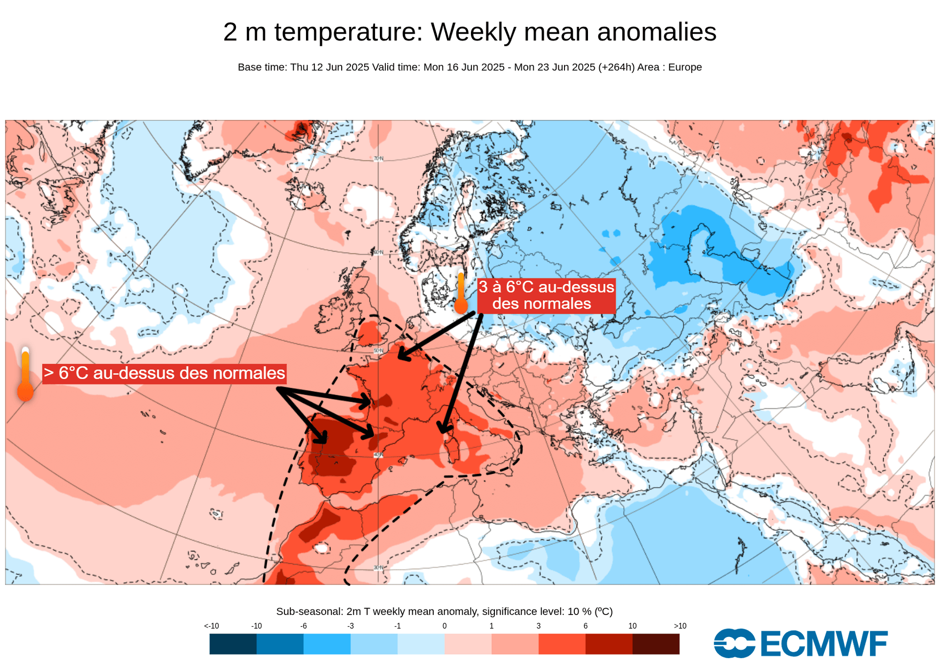 Anomalies de températures à 2m sur la France pour la semaine du 13 au 22 juin 2025 – ECMWF