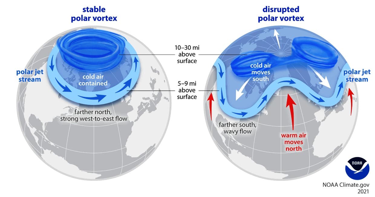 La fonte des glaces polaires tend à faire onduler le jet stream, pouvant aboutir à des pics de douceur et de froid - NOAA
