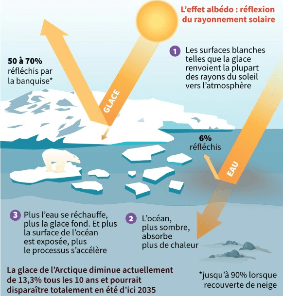 Le recul de la banquise polaire a une première conséquence directe : un recul de l'effet albédo. On parle ici de réflexion du rayonnement solaire. En effet, les surfaces blanches sont les plus réfléchissantes. En l'occurrence, la banquise réfléchit 50 à 70% de la lumière solaire, qui n'est donc pas absorbée par le sol et ne provoque pas de réchauffement. À l'inverse, la surface de l'océan ne réfléchit que 6% de la lumière solaire. L'eau liquide absorbe donc près de 10 fois plus d'énergie lumineuse que la glace. Si la banquise fond, le recul de l'effet albédo provoque donc un réchauffement bien plus rapide.
