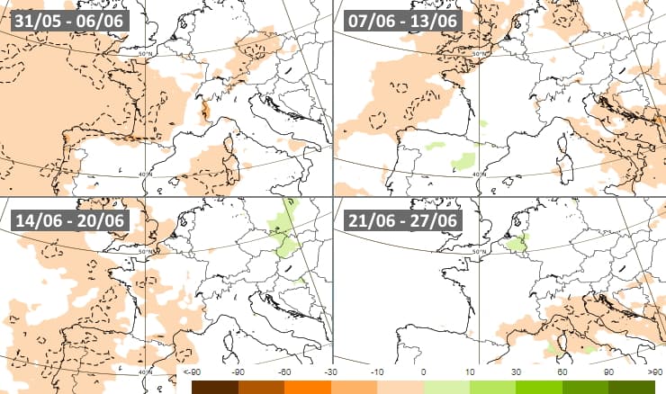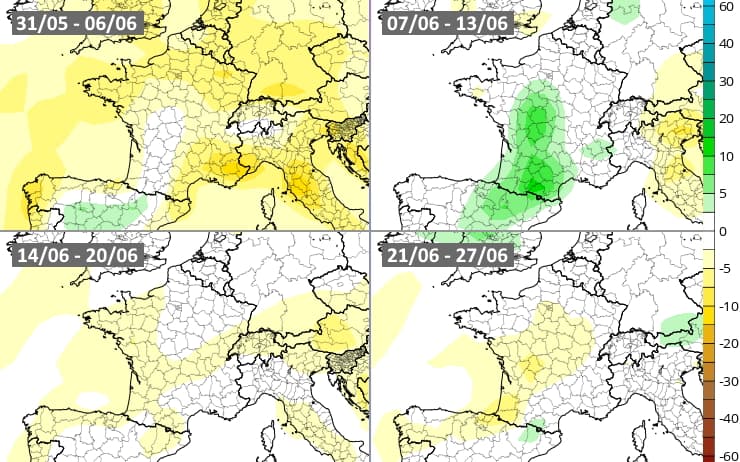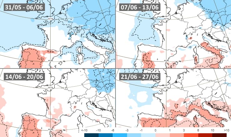 Le modèle européen mise sur un début juin encore relativement frais sur les régions du nord, de saison dans le sud. La tendance s'inverserait très progressivement au cours de la suite du mois avec l'apparition d'anomalies chaudes à partir de la mi-juin sur l'ouest et le sud de la France. La chaleur pourrait se montrer plus nette au cours de la dernière décade de mai 2021 sur les régions méridionales. Le nord, quant à lui, connaîtrait un mois plus classique.