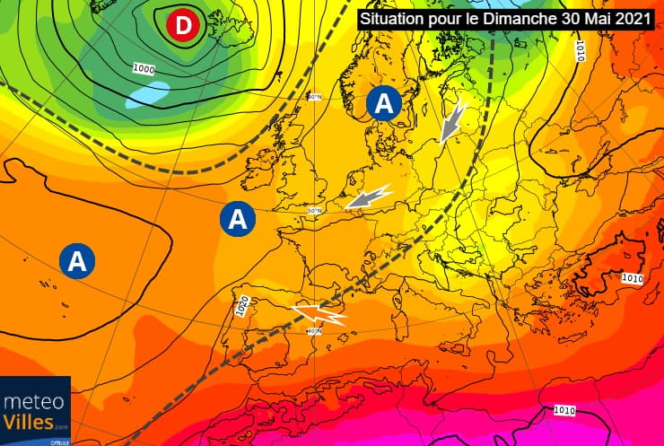 Après avoir passé de longues semaines assez loin de nous, l'anticyclone va progressivement regonfler vers la France à partir du jeudi 27 mai 2021. D'ici la fin de la semaine, c'est une barrière anticyclonique qui se constituera des Açores jusqu'à la Scandinavie en passant par la Mer du Nord et la France. Les pressions vont alors approcher les 1030 hPa sur l'Angleterre, des niveaux plus atteints depuis un petit moment.
