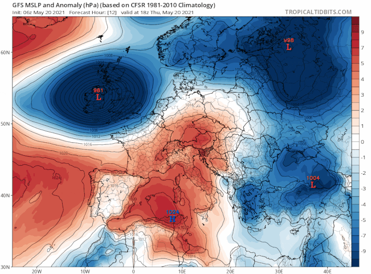 Anomalie de pressions (dépression en bleu, anticyclone en rouge) du 21 au 31 mai 2021 - via tropicaltidbits.com