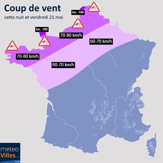 C'est en toute logique que la proximité de cette dépression très creuse va engendrer un fort coup de vent dès la nuit du jeudi 20 au vendredi 21 mai sur la Manche. Les fortes rafales souffleront tout au long de la journée de vendredi sur le nord-ouest de la France, jusqu'en Belgique. Dans les terres, elles seront généralement comprises entre 60 et 80 km/h et parfois accompagnées d'averses. Elles atteindront 90 voire 100 km/h en Manche, notamment vers le Cotentin ou les caps exposés du Pas-de-Calais.