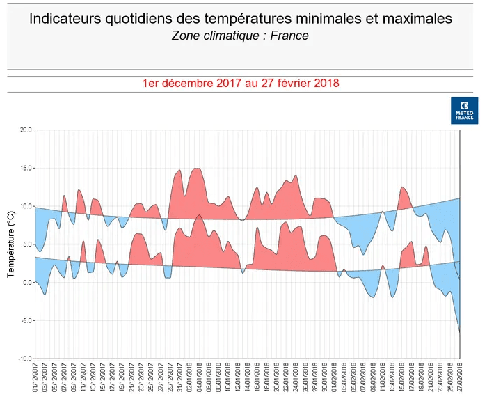 Anomalie thermique quotidienne (minimales & maximales) en France durant l'hiver 2017-2018 - Météo France