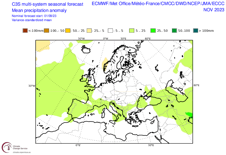 Anomalie pluviométrique pour novembre 2023 selon la moyenne des différents modèles saisonniers - via Copernicus