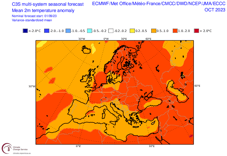Selon les prévisions du modèle européen, l'anomalie chaude du mois de septembre 2023 se prolongerait au cours du mois d'octobre. La première semaine serait encore estivale, notamment sur les régions de la moitié sud où une forte anomalie est envisagée. Bien que s'atténuant quelque peu, cette anomalie resterait ensuite présente jusqu'à la fin du mois d'octobre 2023, maintenant des valeurs 2 à 3°C au dessus de la normale sur l'ensemble du mois. C'est donc un mois très doux qui est envisagé par ce modèle.