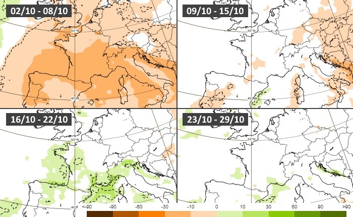 Anomalies pluviométriques hebdomadaires en octobre 2023 - modèle européen via ECMWF