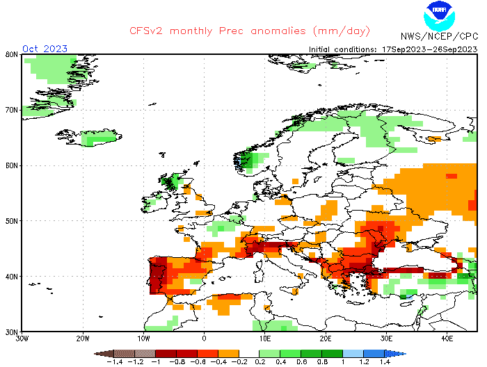 Anomalie pluviométrique en Europe pour le mois d'octobre 2023 - modèle américain via NOAA