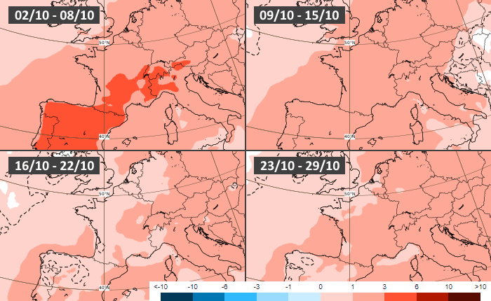 Anomalies thermiques hebdomadaires en octobre 2023 - modèle européen via ECMWF