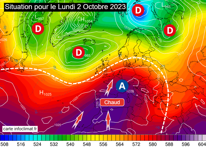 Situation à échelle continentale pour le lundi 2 octobre 2023 - carte infoclimat.fr