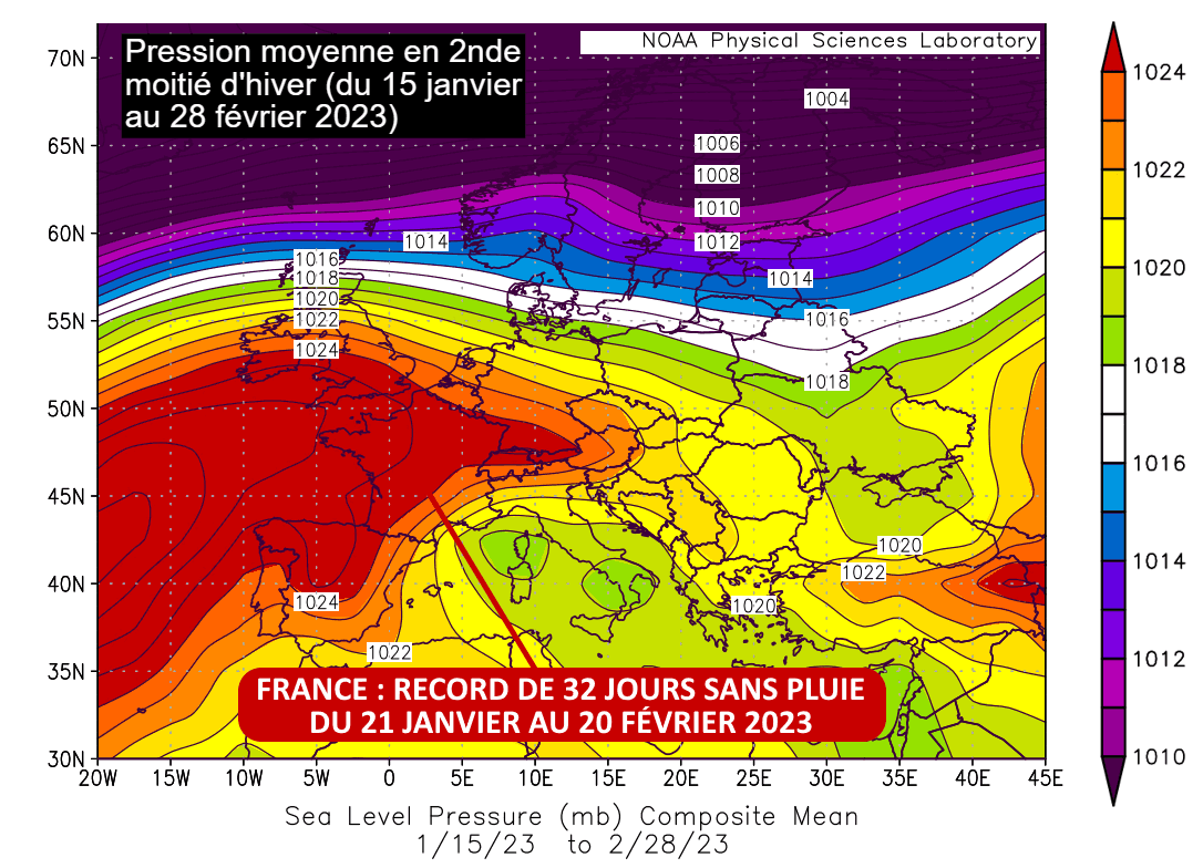 Depuis plusieurs années, la France fait face à une multiplication des périodes de blocages anticycloniques. Celle-ci a pris une tournure inédite depuis le milieu de l'année 2021. Récemment, nous avons assisté à un blocage anticyclonique surpuissant dominant la troisième décade de janvier 2023 ainsi que l'intégralité du mois de février 2023 ! Durant la deuxième moitié de l'hiver, la pression moyenne en France a dépassé les 1025 hPa dans le nord-ouest de l'hexagone. Résultat, la France a enregistré 32 jours consécutifs sans pluie (cumul quotidien national inférieur à 1 mm) du 21 janvier au 20 février 2023, du jamais-vu !