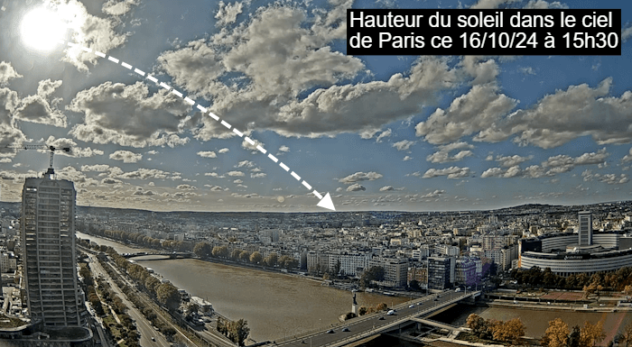 Hauteur du soleil dans le ciel de Paris le mercredi 16 octobre 2024 à 15h30 - Météo Paris