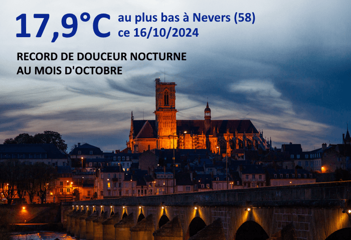 La valeur nocturne la plus exceptionnelle de ce mercredi 16 octobre 2024 est sans doute celle de Nevers. La capitale de la Nièvre, réputée pour ses nuits fraîches, a enregistré une valeur minimale de 17,9°C la nuit dernière ! Il s'agit tout simplement d'un record de température minimale pour un mois d'octobre ! Ce record est d'autant plus significatif qu'il intervient en deuxième moitié de mois, alors que la durée de la nuit est bien plus importante qu'au début du mois. En effet, celle-ci s'est allongée de 50 minutes entre le 1er et le 16 octobre, rendant ce record stupéfiant !
