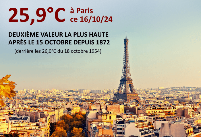 Parmi les villes qui ont atteint la barre des 25°C, la valeur de Paris est particulièrement remarquable. Avec une maximale de 25,9°C, la capitale a connu son 16 octobre le plus chaud depuis le début des relevés. Plus significatif encore : il s'agit de la deuxième plus haute valeur enregistrée après une mi-octobre depuis l'ouverture de la station en 1872 ! En 152 ans de mesures, seul le 18 octobre 1954 avait affiché une chaleur plus tardive avec 26,0°C.