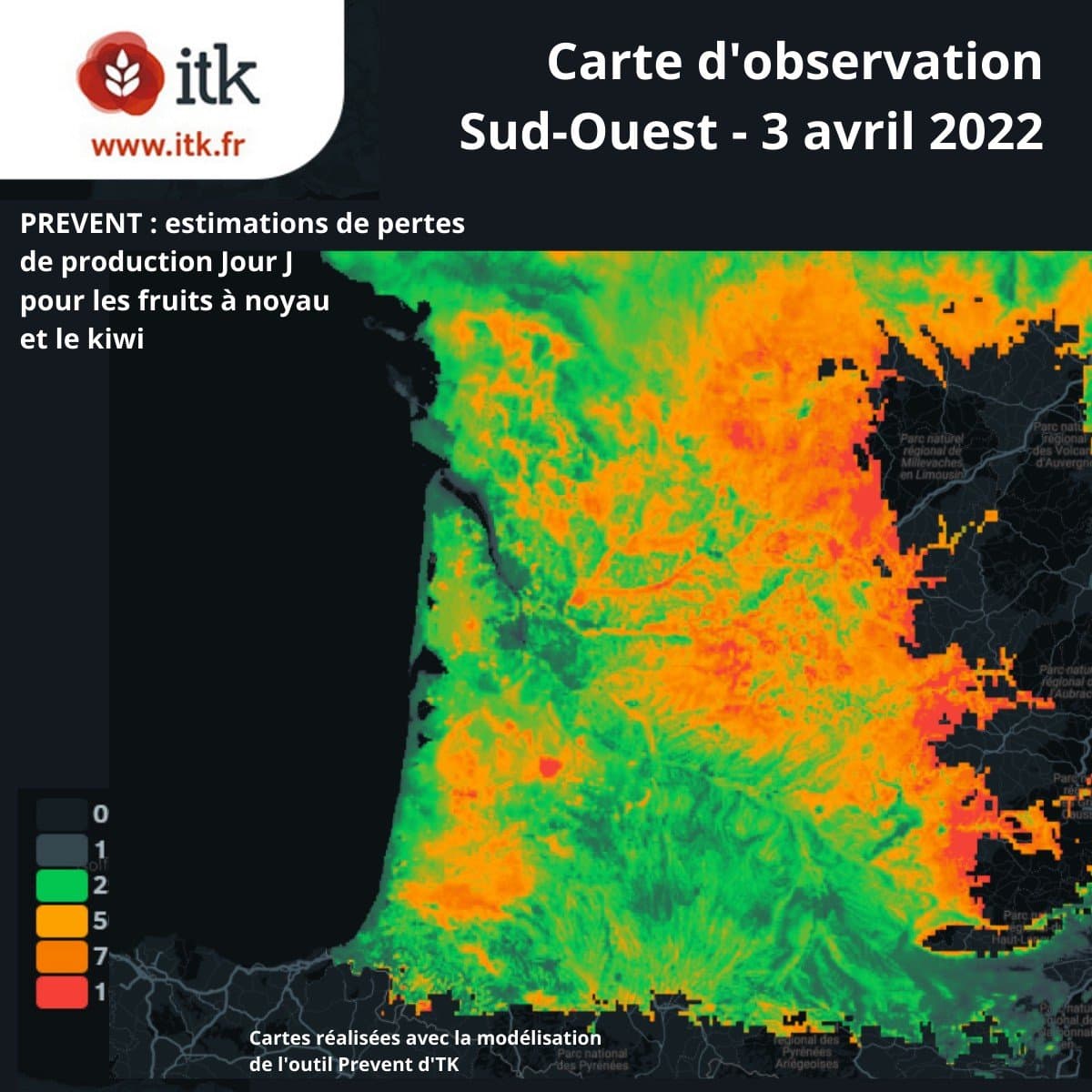 Carte d'observation des pertes de production dues au gel sur les fruits à noyau dans le Sud-Ouest - 3 avril 2022 - Twitter Serge Zaka / ITK