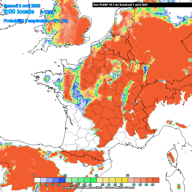 Probabilité de gel - matinées des samedi 2, dimanche 3, lundi 4 et mardi 5 avril 2022 - Modèle PEArpège via Météociel
