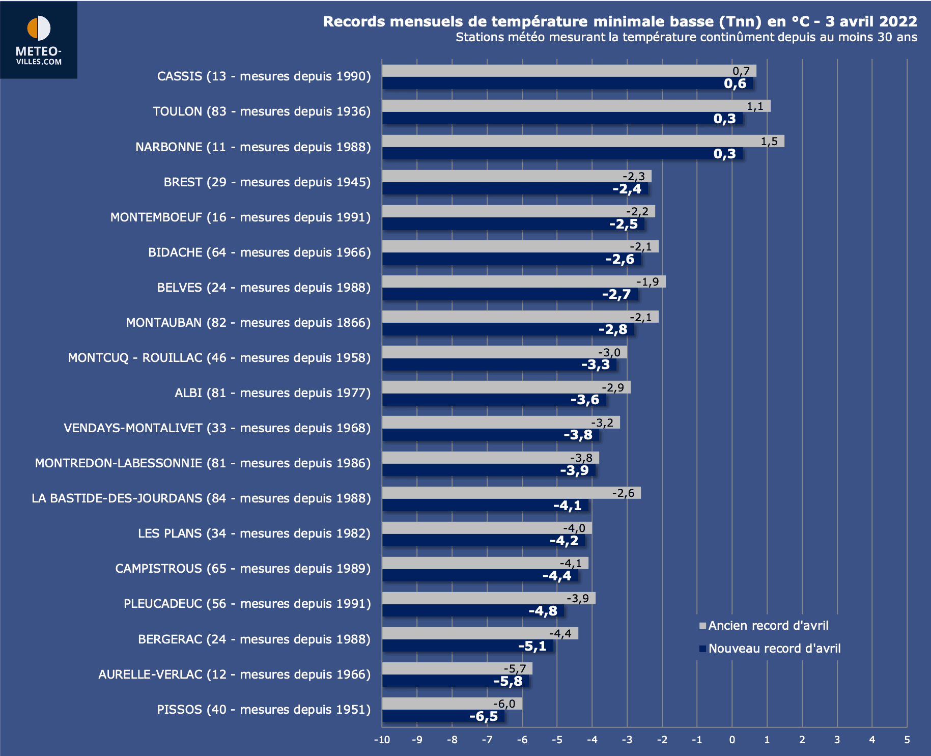 Mais ce sont les températures minimales qu'il faudra scruter avec attention ces prochains jours. Si de premiers records mensuels ont été battus près de la Méditerranée ce samedi matin, les gelées se sont largement étendues dimanche matin, allongeant sensiblement la liste des records. Une liste bien provisoire, en attendant la nuit de dimanche à lundi qui s'annonce comme la plus froide de la série.