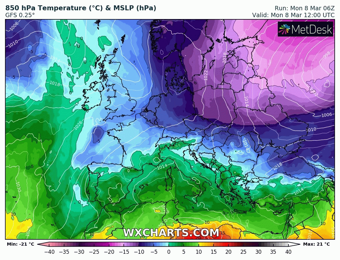 Animation des températures à 850 hPa entre ce lundi 8 et jeudi 11 mars sur l’Ouest de l’Europe – Modèle GFS via WX CHARTS