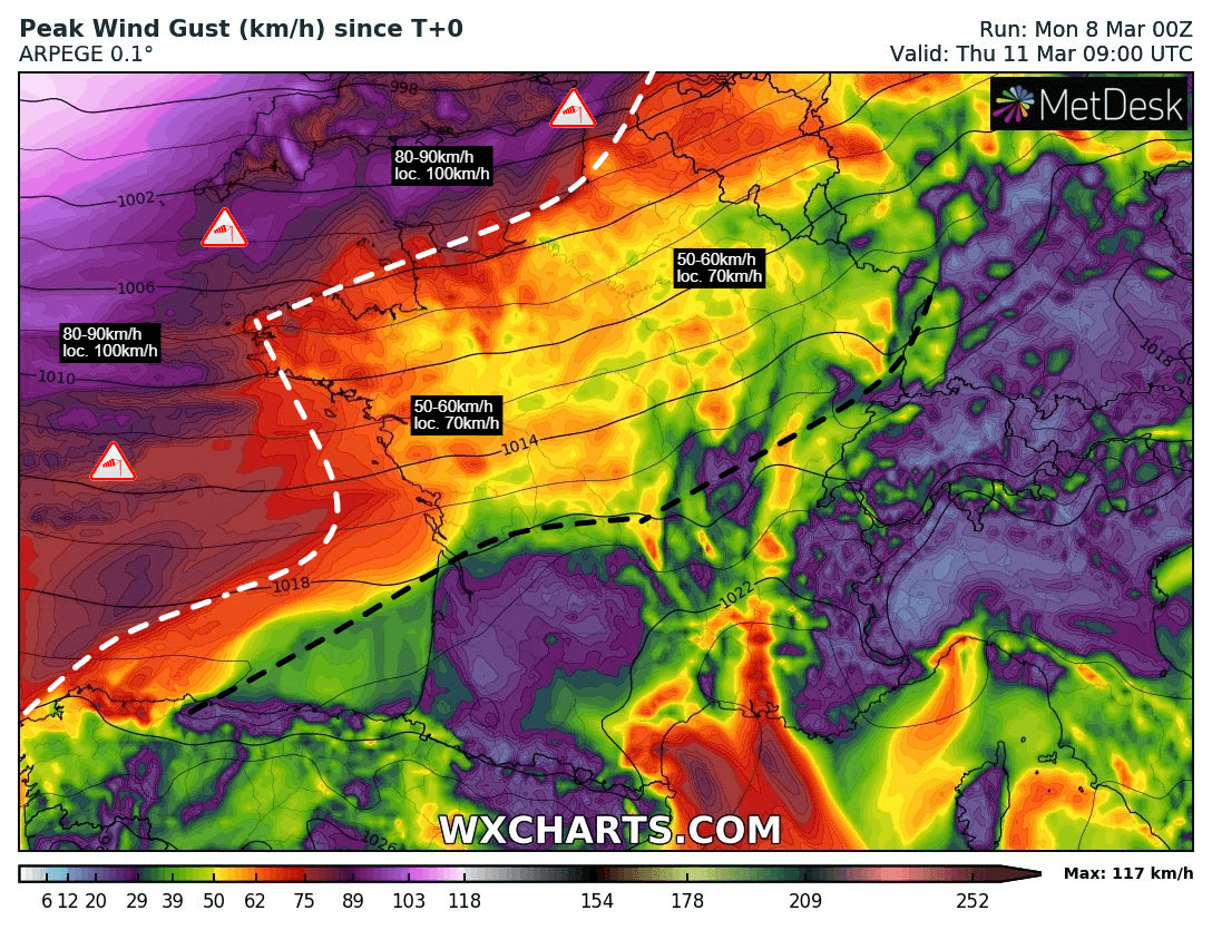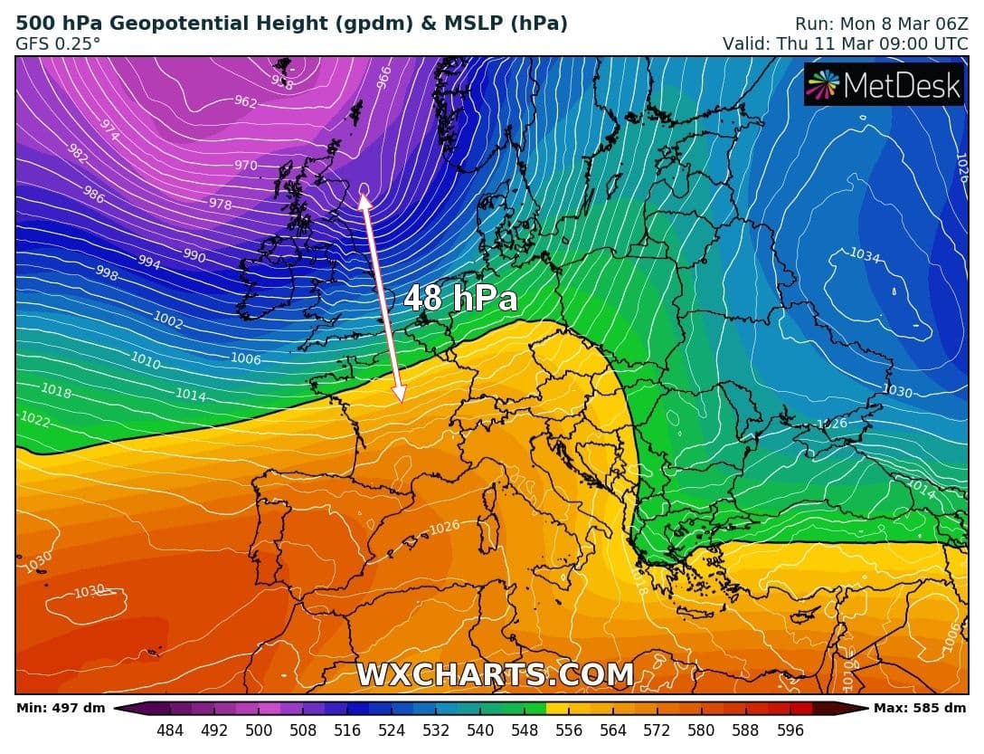 Important gradient isobarique entre les  îles britanniques et la France ce jeudi 11 mars – Modèle GS via WWX CHARTS