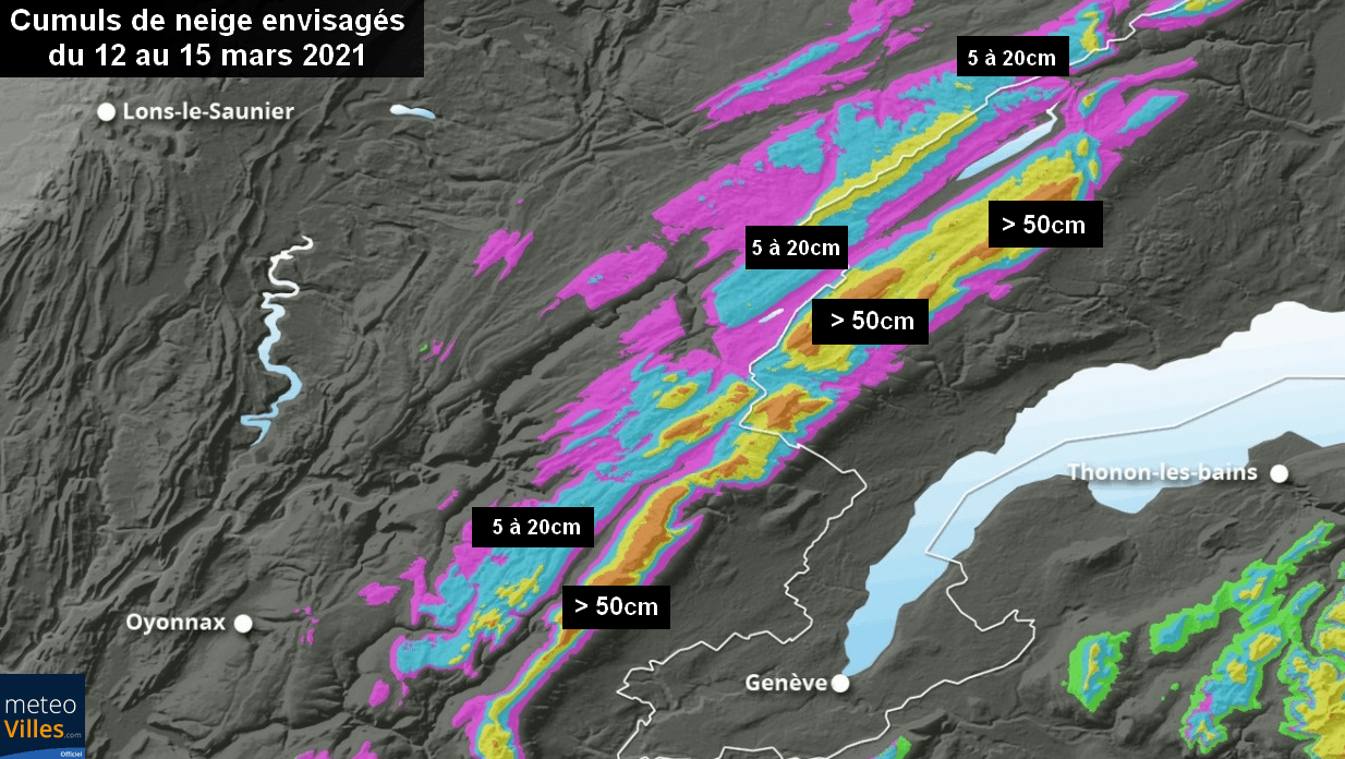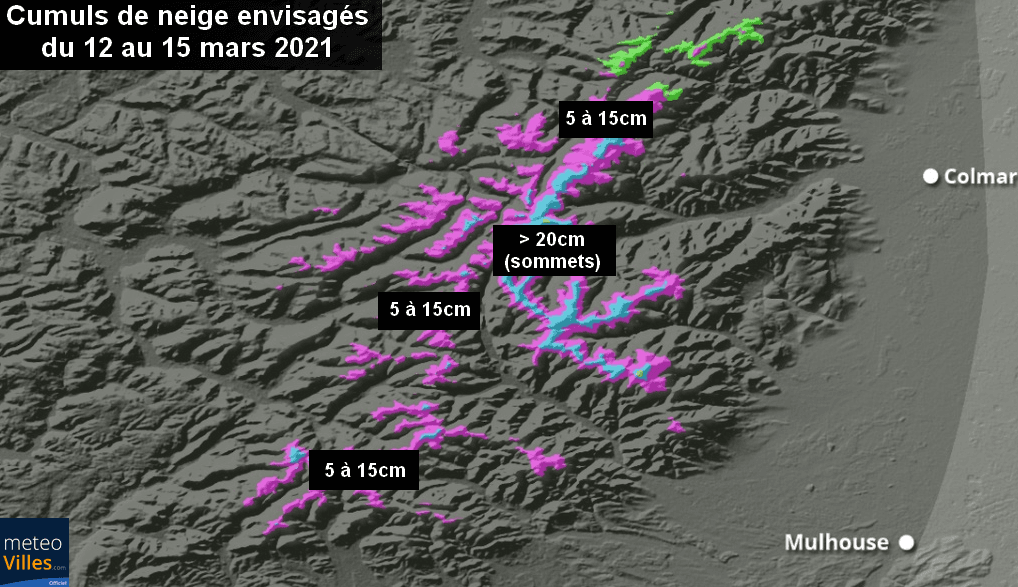 Cumuls de neige attendus en fin de semaine sur le Jura et les Vosges – via skipass, modifié par Meteo-Villes