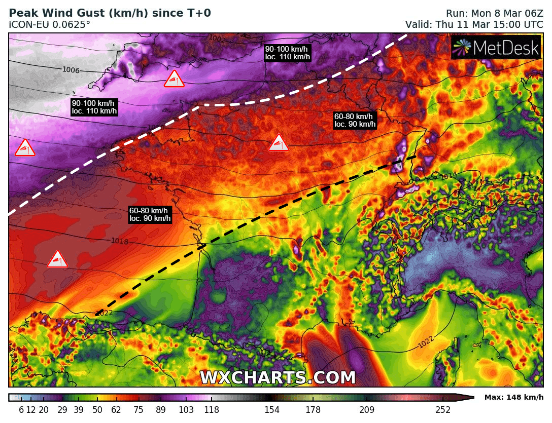 Différence d’intensité du coup de vent attendu entre Mercredi 10 et Jeudi 11 mars sur la moitié Nord – Modèles Arpèe (haut) et ICON (bas) modifié par Meteo-Villes