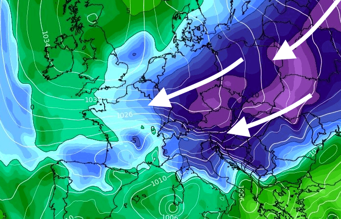 Après le retour des nuages et de quelques pluies au milieu de cette semaine (notamment les mercredi 22 et jeudi 23 février 2023), l'anticyclone se consolidera de nouveau sur les Îles Britanniques durant le week-end des 25 et 26 février. Il s'affirmera en début de semaine prochaine et jusqu'au début du mois de mars 2023 entre les Îles Britanniques et la Mer du Nord avec des pressions comprises entre 1035 et 1040 hPa en son centre ! Ce dernier dirigera un flux continental de secteur nord-est sur la France à partir de ce dernier week-end de février, renforcé par des anomalies dépressionnaires en Méditerranée.