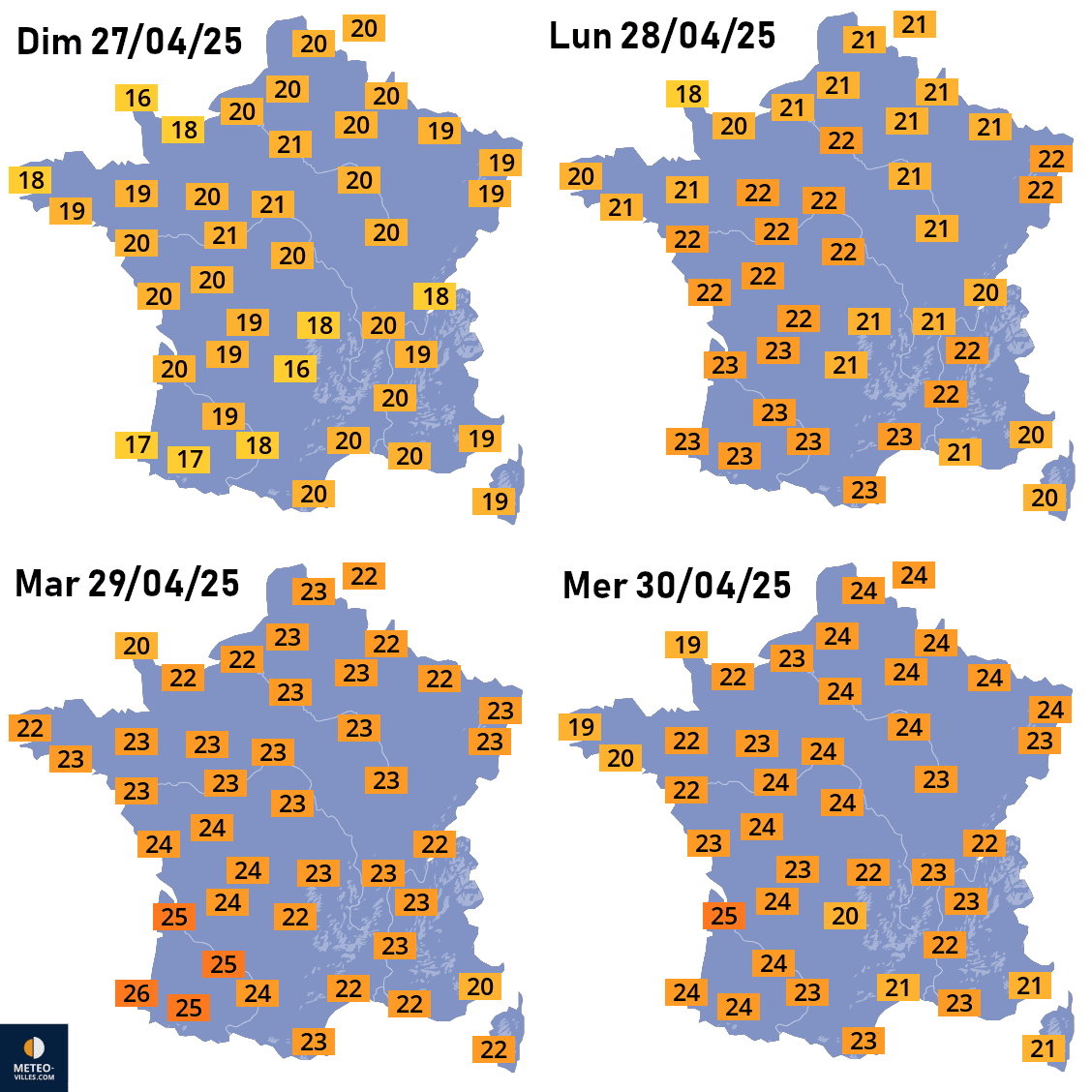 Températures maximales prévues du dimanche 27 au lundi 30 avril 2025 - Météo Villes