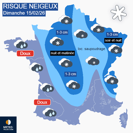 Risque de neige pour le dimanche 15 février 2026 - Météo Villes