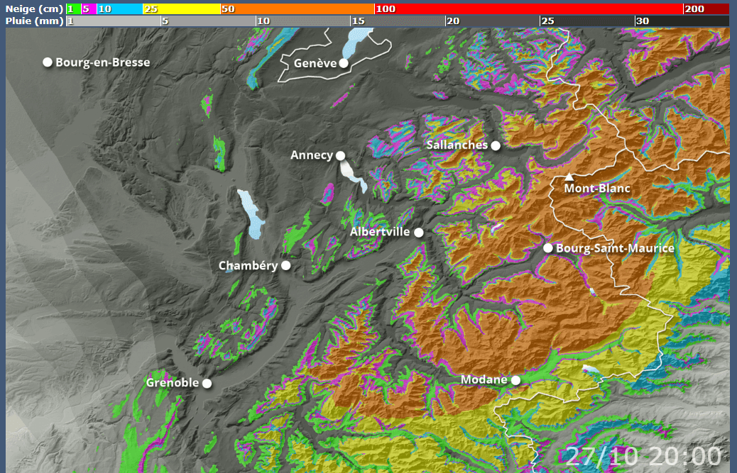 Comme souvent, ce sont donc les massifs savoyards qui seront les plus touchés par les chutes de neige. D'ici au lundi 27 octobre 2025, les altitudes situées au dessus de 1800-2000 mètres vont bien souvent atteindre et dépasser les 50 cm en Haute-Savoie et en Savoie (zones en orange sur la carte).