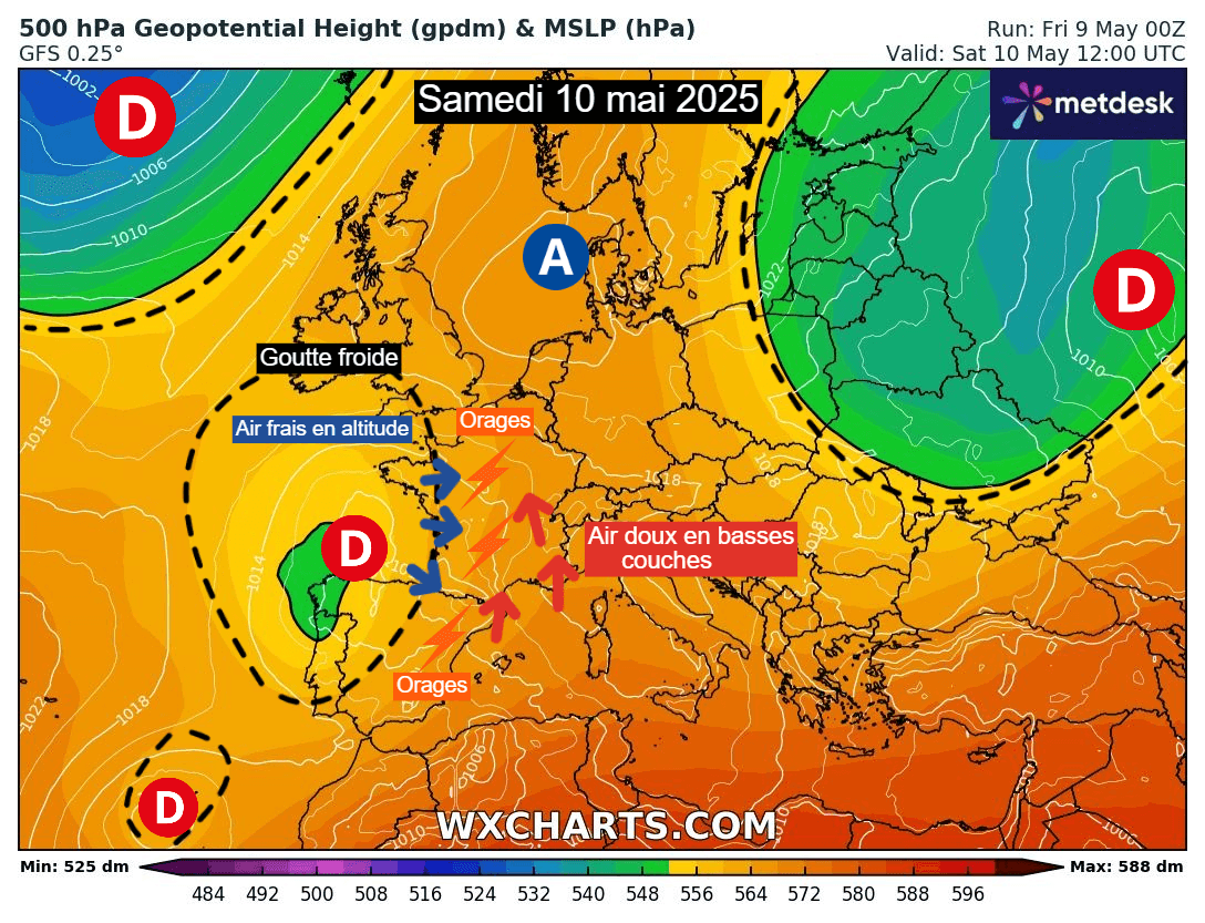 Sous l'influence d'une goutte froide présente entre l'Espagne et le Portugal et se décalant sensiblement vers l'Est durant le week-end, la situation va en effet devenir de plus en plus instable sur la France et ce dès ce samedi 10 mai.