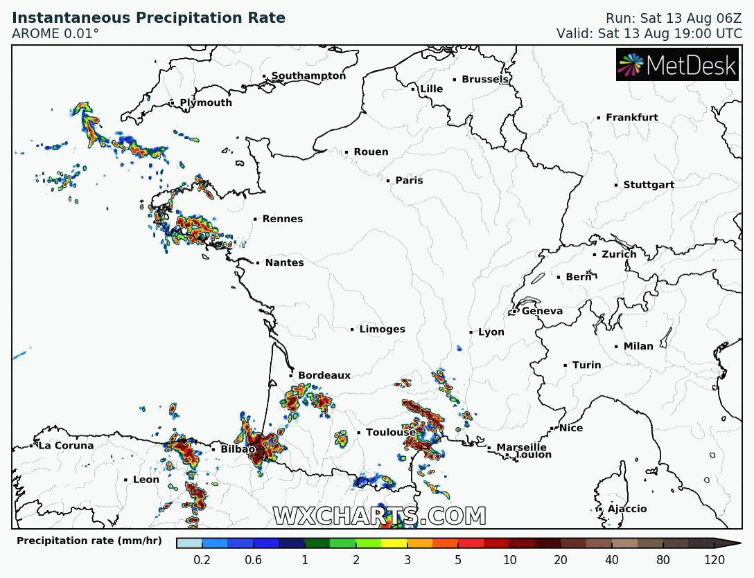 Animation des pluies orageuses prévues - journée du 14 août 2022 - Modèle Arome via WxCharts