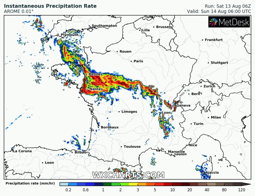 Animation des pluies orageuses prévues - soirée et nuit du 13 au 14 août 2022 - Modèle Arome via WxCharts