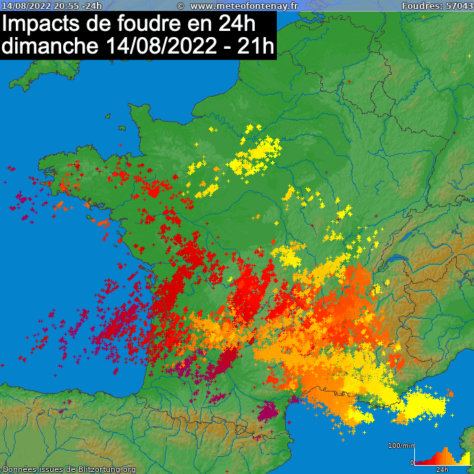 Impacts de foudre et cumuls de pluie en 24h, dimanche 14 août 2022 à 21h - cartes Blitzortung et Infoclimat