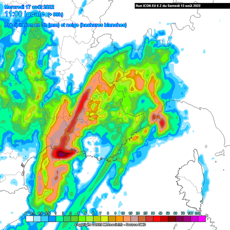 Cumuls de pluie prévus - samedi 13 et dimanche 14 août 2022 - Météo-Villes