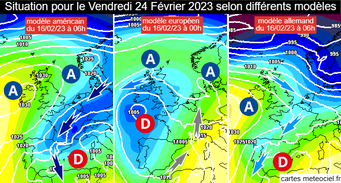 Situation pour le vendredi 24 février 2023 selon les modèles américain, européen & allemand - via meteociel.fr