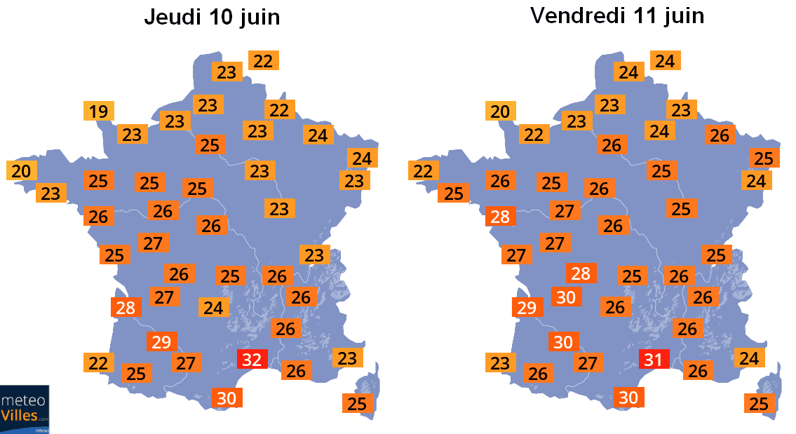 Températures maximales prévues sur la France entre le jeudi 10 et le vendredi 11 juin 2021 – Météo-Villes