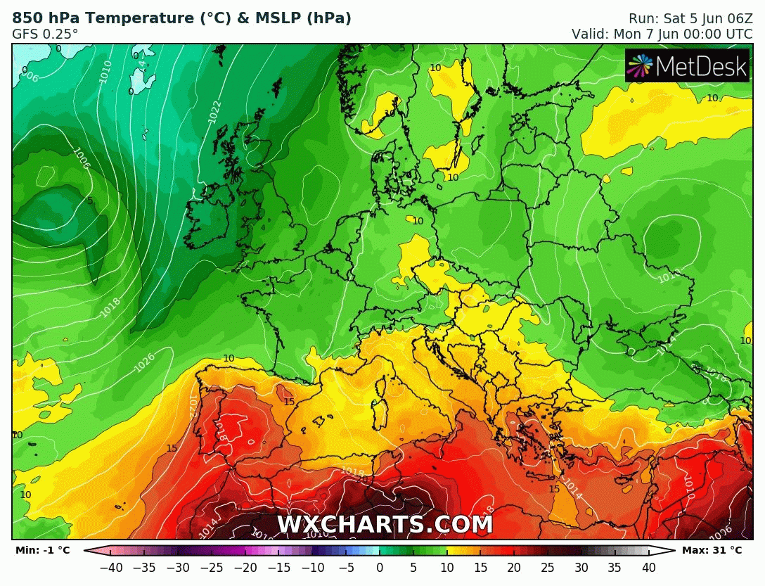 Animation de l’évolution des températures à 850 hPa sur l’Ouest de l’Europe du lundi 7 au samedi 12 juin 2021 – Modèle GFS via WX CHARTS