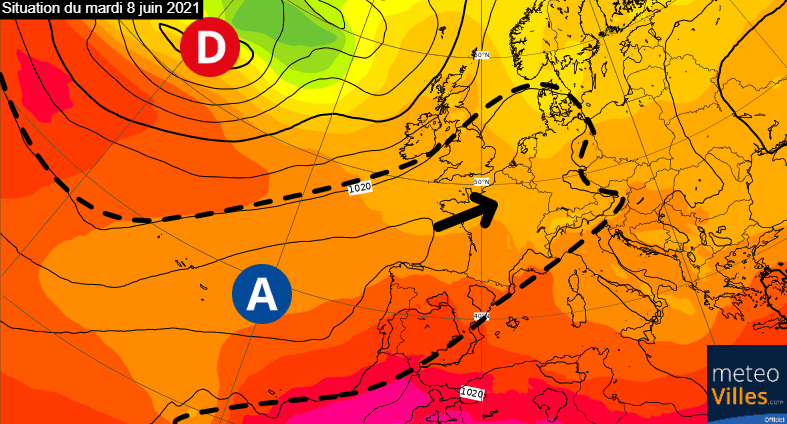 Situation du mardi 8 juin 2021 sur l’Ouest de l’Europe – ECMWF, modifié par Météo-Villes