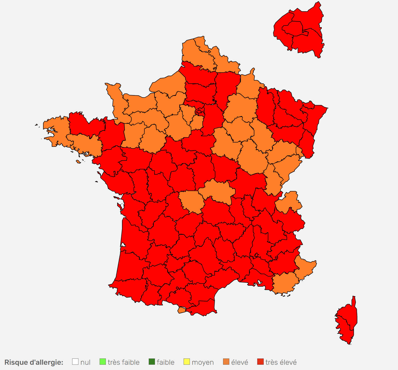 Carte du risque d'allergie sur la France en ce samedi 5 juin 2021 - Via pollens.fr