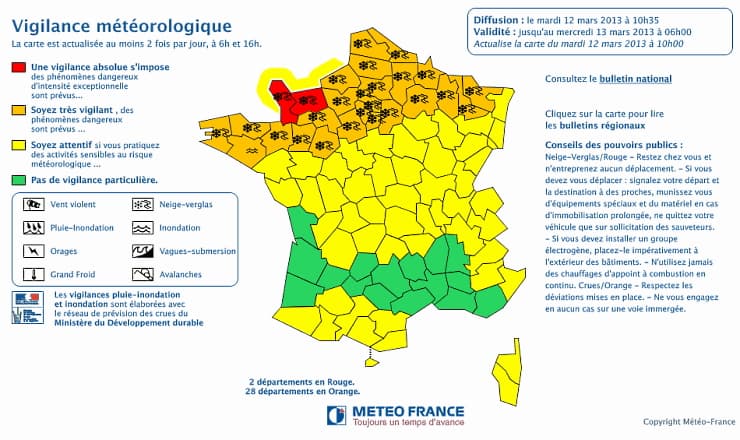 Carte de vigilance en vigueur le mardi 12 mars 2013 - via Météo France