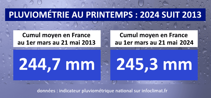 Si les printemps 2024 et 2013 sont incomparables thermiquement parlant, ils le sont beaucoup plus en terme de pluviométrie. Si l'on considère les données du 1er mars au 21 mai 2013, le cumul moyen de pluie sur la France avait été de 244,7 mm. En ce qui concerne ce printemps 2024, on a relevé en moyenne 245,3 mm de pluie en France entre le 1er mars et le 21 mai. Les deux cumuls sont quasiment identiques, signe que la pluviométrie de ce printemps 2024 suit les standards de celle du printemps 2013. C'est pour cette raison que le ressenti de printemps "pourri" est aussi prononcé, malgré des températures bien plus hautes qu'en 2013.