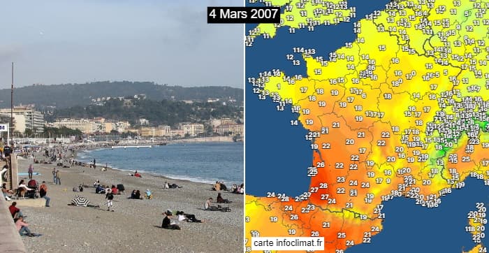 La plage de Nice et les températures maximales du 4 mars 2007 - via infoclimat.fr