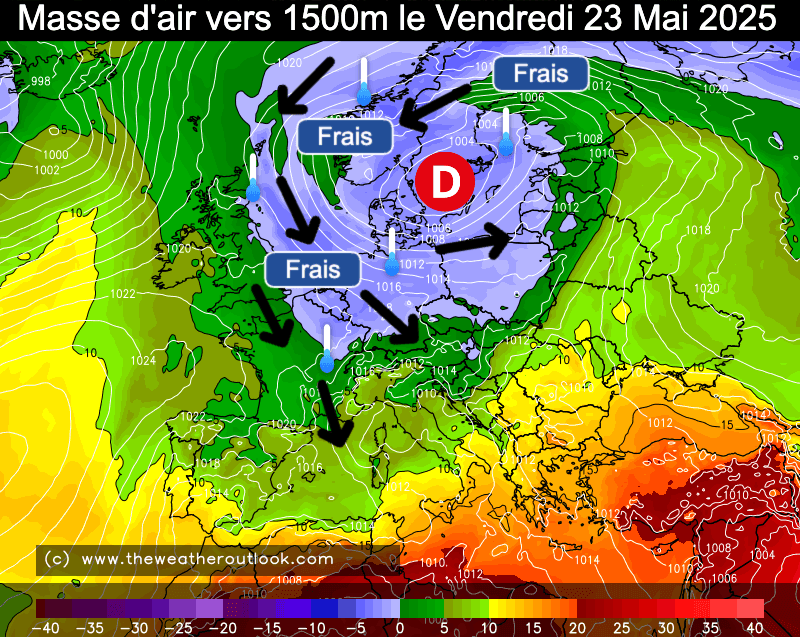 Une dépression centrée sur la Scandinavie va piloter un flux de nord sur la France au cours des prochains jours. Celle-ci va amener une masse d'air très frais. En altitude vers 1500 mètres, la température de la masse d'air passera dans le négatif dans le nord-est de la France durant la journée du vendredi 23 mai 2025, des niveaux très bas pour une dernière décade de mai.
