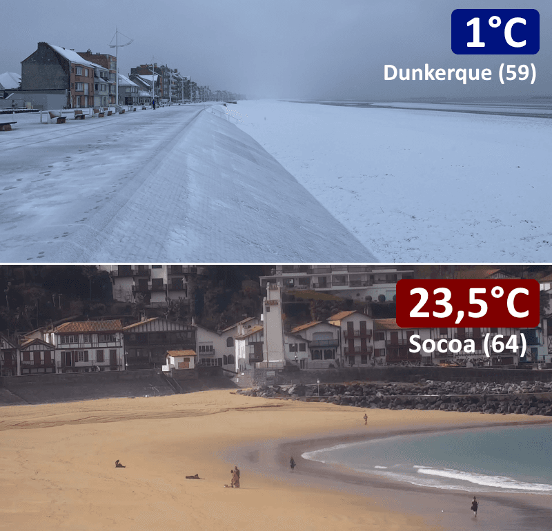 Un important contraste de masses d'air est en cours sur l'Europe de l'Ouest. L'air froid reste présent sur les Îles Britanniques et la Mer du Nord, débordant sur l'extrême nord de la France, tandis qu'un air doux d'origine subtropicale remonte sur la péninsule ibérique et les trois quarts de l'hexagone. Ce contraste s'illustrait parfaitement ce mercredi 8 mars 2023 avec des chutes de neige et une température à peine positive sur les rivages de la Mer du Nord à Dunkerque tandis que l'on dépassait les 23°C sur les plages du Pays Basque !