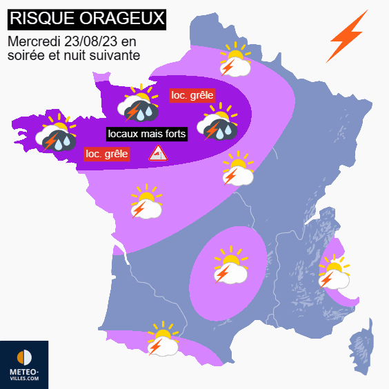 Les premiers orages devraient se former dans le nord-ouest de la France en soirée du mercredi 23 août, à partir de la Bretagne, du nord des Pays de la Loire et de la Normandie. Ils devraient progresser vers le nord du Centre et l'Île-de-France durant la nuit de mercredi à jeudi. Si ces derniers ne seront pas généralisés, ils pourront être virulents avec d'intenses pluies accompagnées de grêle, de puissantes rafales de vent et une activité électrique soutenue. La prudence sera donc de mise.