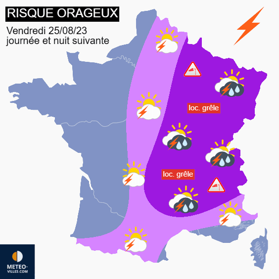 La journée du vendredi 25 août 2023 devrait rester instable dans l'est de la France. De nouveaux orages pourront se déclencher en matinée et après-midi mais c'est en soirée et nuit suivante qu'ils s'annoncent les plus fréquents sur les régions de l'est, jusqu'au nord du Languedoc. Une fois de plus, il faudra surveiller le risque de phénomènes violents avec des chutes de grêle, une activité électrique importante et des bourrasques de vent tempétueuses.